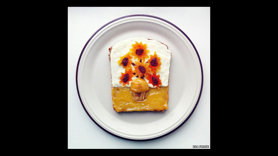 "The Dutch painter, Vincent Van Gogh, did two sunflower series, one of the flowers lying on the ground (the Paris series) and a later set with the flowers in a vase (the Arles series)," explains Ida. "I prefer the latter and used the above image as my starting point when creating the toast version. The sunflowers are made by apricots and raisins, in a fig vase. The background is yoghurt and passion fruit curd."