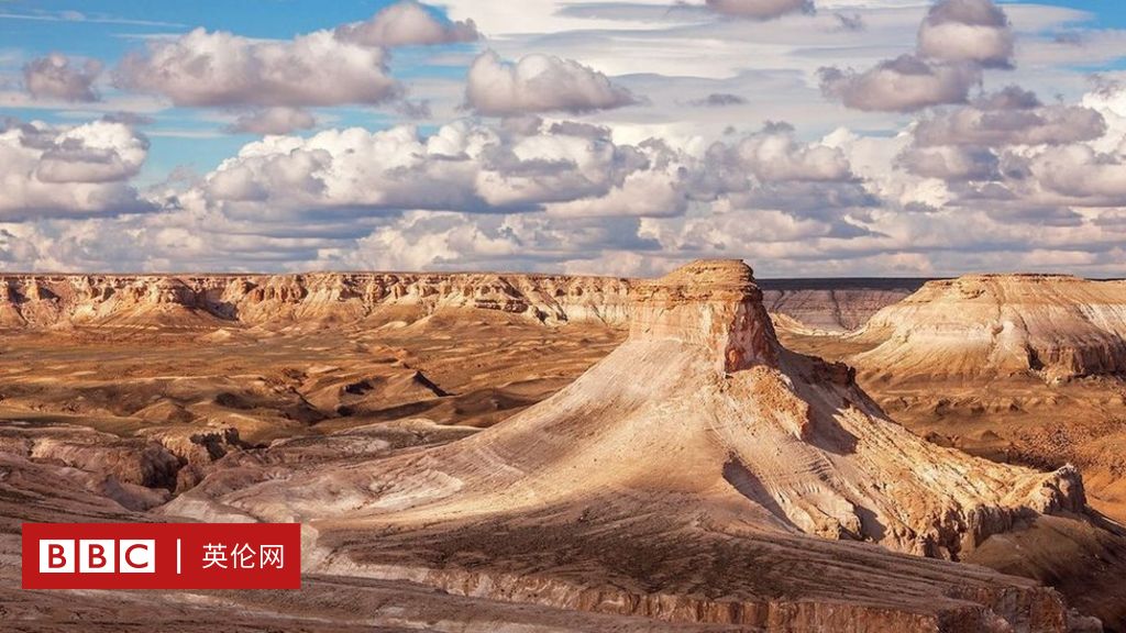 位於裏海和鹹海之間,橫跨哈薩克斯坦、烏茲別克斯坦和土庫曼斯坦這中亞三國的烏斯秋爾特高原(Ustyurt plateau),是有著一道道土色如同燒焦的乾旱荒漠峽谷的大地,峽谷中聳立著無數鐵鏽紅色的尖堆和高台。