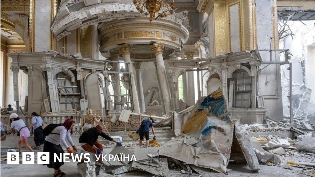 Парафіяни розчищають завали всередині Спасо-Преображенського собору в центрі Одеси після російського ракетного удару.