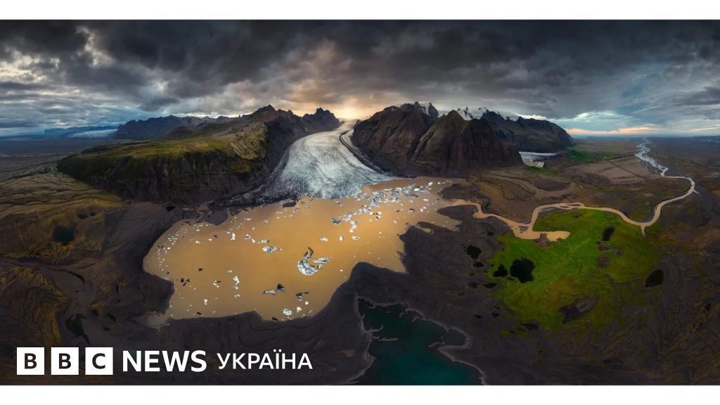У своїй серії Сарланг зняв суворі ісландські гірські льодовики. Цей панорамний знімок, зроблений за допомогою дрону. Він відкриває вид на льодовик Скафтафетль, що впадає в озеро, з якого льодовикова річка прямує далі до океану.