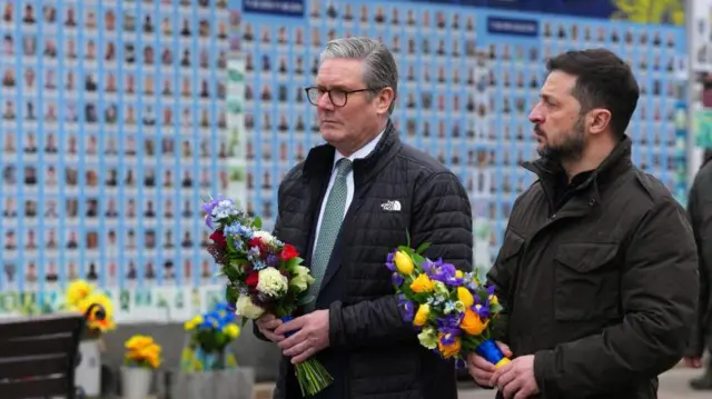 Після того, як солдати поклали вінки, Стармер і Зеленський поклали свої букети до стіни біля Михайлівського золотоверхого монастиря.