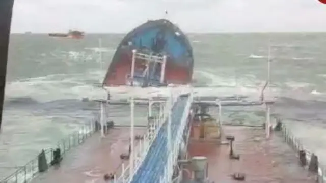 У телеграм каналі "ЧП Севастополь" опублікували відео, на якому видно, як частина танкера швидко йде під воду і написали: "Хвилі розрубали судно навпіл".