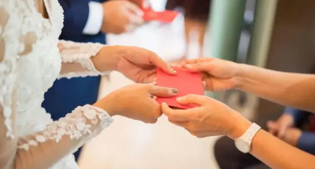 У багатьох азійських культурах гості зазвичай дарують молодятам гроші в червоних конвертах як символ удачі.