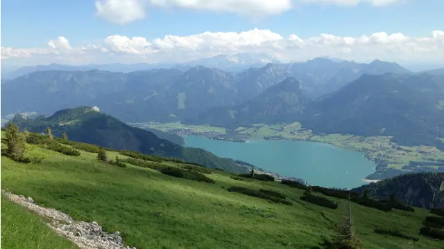 Ми на кінцевій зупинці. Тут прохолода. Примхлива погода вирішила відкрити всю панораму: ось шпилясті гори з хмаринками, величне озеро. Ось - іграшковий Санкт-Вольфганг далеко внизу.