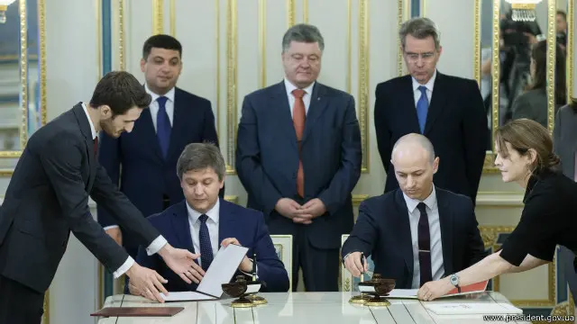 У церемонії підписання угоди взяли участь президент Порошенко, прем'єр-міністр Гройсман, міністр фінансів Данилюк, посол США в Україні Джеффрі Пайєтт, а також виконувач обов'язків директора Місії Агентства США з міжнародного розвитку (USAID) в Україні Джоел Сандефур.