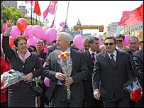 Представники Соціалістичної партії України на чолі з лідером Олександром Морозом разом з ветеранами Червоної Армії пройшли окремою урочистою ходою від Бессарабської площі до площі Слави, віддаючи данину пам'яті воїнам-визволителям під переважно червоними прапорами і партійною символікою. Олександр Мороз закликав "не спекулювати на темі про статус воїнів УПА, а вирішити це питання без поспіху, не включаючи до коаліційної угоди". Про це він сказав в інтерв’ю журналістам сьогодні після покладання квітів до могили Невідомому солдату у парку Вічної слави в Києві. Як повідомили у прес-службі СПУ, пан Мороз вважає, що “не потрібно під умовою коаліції включати питання, які можуть розколоти суспільство”. За його словами, неодноразово в окремій розмові Президент України Віктор Ющенко висловлювався за те, що треба винести за дужки усі ті питання, які потребують додаткового вивчення і вирішення не в політичний, а в прийнятний для суспільства спосіб. Напередодні, президент Ющенко закликав ветеранів Радянської та Української повстанської армій до примирення заради майбутнього. В сьогоднішньому інтерв’ю телеканалу Інтер пан Ющенко наголосив на відповідальності за це українських політиків. | Також на цю тему Ющенко закликав ВР вшанувати УПА09 травня, 2006 | УКРАЇНА Звернення Ющенка до 9 травня не чують?08 травня, 2006 | УКРАЇНА Єхануров: урядова коаліція на чотирьох08 травня, 2006 | УКРАЇНА | ||||||||||||||||||||||||||||||||||||||||||||||||||||||||||||||||||||||||||||||||||