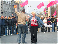 На Майдані весело – прибічники опозиції змішалися з «коаліціянтами» - дехто навіть танцює разом. Агресії та суперечок немає. Ті, що прийшли сюди з прапорами Партії регіонів, Соц- та Компартії, підтримують парламентську більшість та Уряд і вважають указ Президента про проведення дострокових виборів до Верховної Ради незаконним. Поки конституційний суд не винесе рішення з цього приводу - прихильники коаліції залишатимуться на Майдані – про це заявили депутати від більшості.