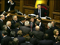 Український парламент обговорив звіт уряду Тимошенко про подолання наслідків впливу світової фінансової кризи на економіку України. Опозиція вимагала відставки чинного кабінету міністрів, проте, Верховна Рада не підтримала відставку уряду прем’єра Юлії Тимошенко. За це рішення проголосували 203 депутати з 226 необхідних. За відставку голосували депутати від Партії регіонів – 172, БЮТ – 1, НУНС – 10, Компартія - 20. З Києва повідомляє Ольга Бурда: