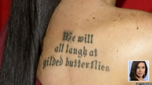 Найпопулярніші – цитати з літературних творів, пісень та філософських роздумів. Щодо шекспірівських тату, Меґан Фокс обрала рядок з «Короля Ліра» – «Метеликів барвистих споглядати», Даніель Лінекер – «Ні, сумніви – це часто вороги, бо через них не вдаємось до спроби, втрачаючи сподіванку на успіх» з п’єси «Міра за міру», а Ліндсі Лохан уподобала «Які нам сни присняться?» з «Гамлета».