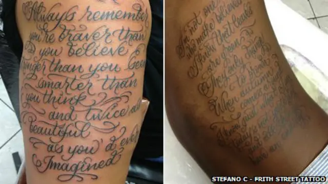 Словесні тату завжди мали своїх прихильників – “Carpe Diem” ("Лови момент") давно стало класикою. Проте з удосконаленням технологій збільшився попит на довгі тексти, каже Стефано С, майстер татуювань з лондонського салону Frith Street Tattoo.