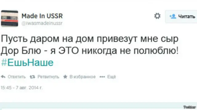 А Made in USSR навіть висловив свою нелюбов до західного сиру у <link type="page"><caption> віршах</caption><url href="https://twitter.com/iwasmadeinussr/status/497347726255083520" platform="highweb"/></link>: