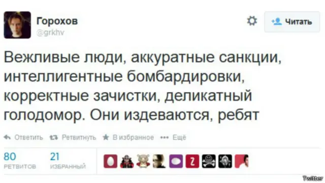 І <link type="page"><caption> іронізує</caption><url href="https://twitter.com/jarawa4/status/497072479618469888" platform="highweb"/></link> Михайло Матвєєв: