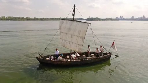 Козаки встановлюють зйомну щоглу, піднімають вітрило і демонструють, як проходив справжній річковий бій у XVII століття - тричі стріляють з гармати.
