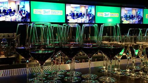 Там все трохи більш формально. Сцена з великим екраном у зелених кольорах кампанії Зеленського.