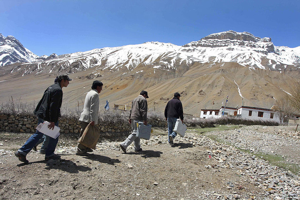 Працівникам виборчих дільниць доводиться долати значні відстані пішки. На спинках вони несуть кисневі балони, спальні мішки, продукти харчування та ліхтарі.