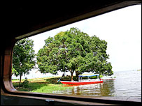 Взагалі-то, у нашого кока – понад 300 рецептів в колекції. Я записала й інші, - включно з фаршированою рибою Матіша! - але до цього дійде трохи пізніше, бо зараз ми підпливаємо до селища у джунглях, і я маю хапати свій мікрофон і бігти. І анаконду, до речі, я теж, нарешті, знайшла... Але про це - згодом! СУБОТА, 10 ТРАВНЯ Вітаю всіх з борта човна «Дом Несто», яким зведена команда Бі-Бі-Сі продовжує подорож Амазонкою, і спочатку - заголовки моїх останніх мандрівних новин: 1. Зустріла свій перший світанок у тропічному лісі. 2. Наслухалася легенд капітана Фернандо. 3. Викупалася в Амазонці, і піраньї мене не з’їли. ОТЖЕ, СВІТАНОК.. ...Я зустріла зовсім не у сентиментальному настрої. Навіть береги Амазонки, оповиті сріблястим серпанком, мене не надто порадували, коли о шостій ранку я вийшла на білосніжну палубу нашого човна.