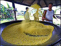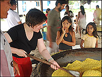 Сьогодні, як я і обіцяла, - про тропічний шторм, футбол, і також - гарні манери в джунглях. Рецепт фаршованої риби Матіша від нашого кока на ім'я Вошингтон (до речі, напрочуд поширене, кажуть, у Бразилії!) - я теж не забуду. Реве та стогне Амазонка Після кількох днів в тропіках я абсолютно забула, як я могла скаржитися на відсутність сонця в Лондоні. Ніколи більше в житті! Тут благаєш лише, щоб вийшли хмари. Але від хмар теж не знаєш чого чекати. Шторм у тропіках, як я переконалася, розвивається впродовж хвилин - і Амазонка міняється невпізнано майже миттєво. У п'ятницю, скажімо, поки тривала інтерактивна пограма Бі-Бі-Сі, до якої я долучилася через супутниковий зв'язок, на річці панував мир і спокій, і наш човен лагідно колихали хвилі - про що я і розповідала Богдану Цюпину і нашим слухачам. На тлі цієї ідилії ми причалили до невеличкого селища в джунглях з чарівною назвою Санта Лусія Чатаріквара - досить значного як для джунглів поселення з кількома десятками будинків, школою, сільським клубом, навіть стадіоном - єдиного у своєму роді на десятки кілометрів тропічного лісу. Понад рікою - великий навіс, і тут я уперше в житті побачила, як роблять борошно з кореня маніоки - ножем знімають шкіру, тоді подрібнюють, пропускаючи через спеціальний агрегат, тоді просіюють та перетирають через дуже красиві плетені сита, і нарешті - підсмажують.