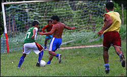 Отже, ми вдихали аромат маніоки, спілкувалися з місцевими мешканцями - їхня доброзичливість і терплячість перед лицем нашої журналістської навали була просто за межами можливого - тоді пішли поспілкуватися зі вчителем місцевої школи.... І тут почалося. Ми розмовляли на освітні теми - скільки учнів, і чи здалеку вони приїжджають, звідки вчителі і які предмети вони викладають - але раптом відчули, що мало що чуємо з того, що вчитель нам розповідає. Нас відволікали гучні удари по даху, яийсь гул, - невеличке приміщення школи, яке складолося з одного класу, просто здригалося. Визирнули - Амазонка реве та стогне - мов той самий Дніпро широкий у незапам'ятні часи, - і дійсно не у пісні, а на наших очах горами хвилі підійма. Це означає - що поки все це не закінчиться, ми не повернемося на наш корабель, і подорож не продовжимо, адже і підійти до берега, і сідати в човни надто небезпечно. Ми ще трохи потовклися під навісом, вдихаючи аромат маніоки, а тоді - коли буря трохи вгамувалася - пішли гуляти селом, і не прогадали - бо уявіть собі - потрапили на футбол. МАТЧ ПІД КАШТАНОВИМ ДЕРЕВОМ Стадіон, ворота, дві команди. "Наші" грають у фуболках, а "їхні" - прибули сюди з іншого села, не уявляю собі за скільки десячтків кілометрів - оголені до пояса. На полі калюжі, схожі на озера, а дощ продовжує лити. Це нікого не зупиняє. Як на мене, я бачила справжній клас бразильського футболу - швидкість, ентузіазм і волю до перемоги. Гравців підтримували невеличка купка шанувальників, які розташувалися всередині і на даху бару - знову ж таки "Каштанового".