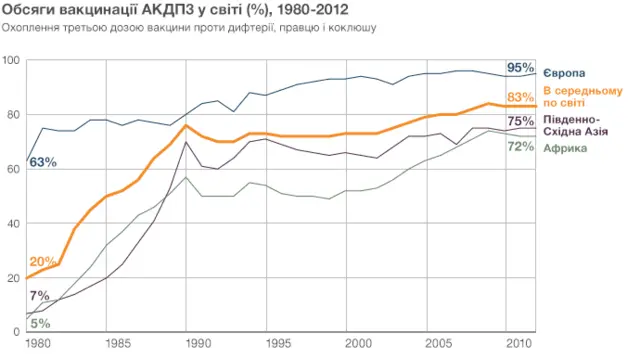 Ліквідація віспи у 1980 р. стимулювала по всьому світу подальші зусилля, спрямовані на боротьбу з хворобами шляхом імунізації. На картах показано, як зростало покриття світу вакцинами з 1980 р. і які країни захищають своє населення найкращим – і найгіршим – чином. Ми обрали саме ці три вакцини (що борються з п’ятьма інфекціями), оскільки вони є показовими щодо різних ступенів успішності у подоланні кількох поширених захворювань.