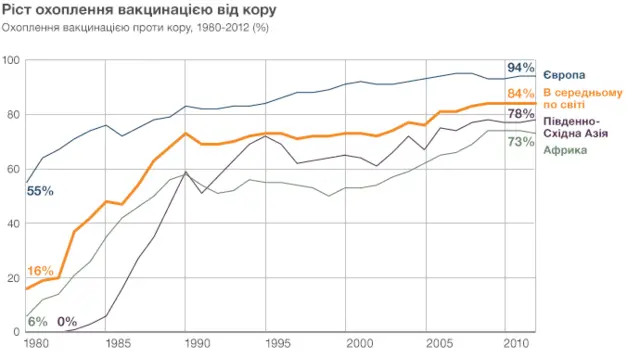 За минулі три десятиліття імунізація від кору значно поширилась, а смертність швидко зменшилась. Проте спеціалістів непокоїть, що останніми роками показники імунізації лишаються практично без змін.
