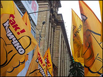 Хоча Володимир Ленін і надалі кидає похмурий погляд, він упродовж останніх міг спостерігати на площі, названій на його честь, кілька масових мітингів, влаштованих політичними партіями і рухами, які не мають нічого спільного з комуністами. Особливу активність виявляє прокладна партія "Наша Україна", яка підтримує президента Ющенка. Її прихильники розмахують помаранчевими прапорами, встановлюють намети та агітаційні стенди, і крім того розважають людей виступами поп-зірок так голосно, що в моєму, збудованому за радянських часів, готелі дрижать вікна. Помаранчева ідеологія не аж так гарно сприймається в тій частині Україні, яка не є, так би мовити, її "природною територією". Це російськомовний схід, де чимало людей і надалі шкодують, що розпався Радянський Союз, і де Європейський Союз сприймається як щось віддалене і не надто актуальне. Один з найпопулярніших українських поп-зірок Олег Скрипка перебував тут минулими вихідними. Я мав зустріч з ним в його розкішному готелі-люкс після концерту на площі Леніна. "Так, - сказав він, - Помаранчева революція зазнала чимало проблем. Є багато чого, на що можна нарікати". Однак, він пояснив все це, так званим, "пост революційним похміллям". Втім, ні, він не хоче повертатися до минулого. Він хотів би за допомогою своєї музики переконувати людей у тім, що потенціал Помаранчевої революції можна і надалі використовувати задля позитивних змін в Україні. Дещо пізніше з’явився колишній чемпіон світу з боксу у над ваговій категорії Віталій Кличко. Нині він перетворився на політика і очолив виборчий список блоку, що обстоює ліберальну, реформаторську програму. З трудом проштовхуючись крізь натовп журналістів, я нарешті наблизився до нього і запитав про те, що він хотів би сказати українським виборцям. "Я розчищу завали, - сказав він. - Я зроблю життя кращим."