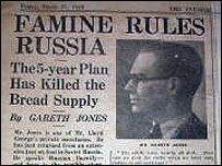 Джонс повернувся в Берлін 29 березня, надрукувавши статті про голодомор, а це спровокувало майже негайний відповідний удар від Дюранті в накладі Нью-Йорк Таймс від 31 березня, "Росіяни голодні, але не голодають". Принижуючи Джонса, Дюранті виправдовував примусову колективізацію сільського господарства, з ганебною заувагою: "грубо кажучи, неможливо засмажити яєшню не розбивши яєць". Приховуючи правду він писав: "нема ніякого фактичного голодування чи смертельних випадків від голоду, але є широко розповсюджена смертність від хвороб через недоїдання". Дюранті ніколи не визнавав як 26 березня він виголошував у британській амбасаді що: "цілих 10 мільйонів людей померли прямо чи непрямо від нестачі їжі в СРСР минулого року". Одначе, в 1933 році він отримав премію Пуліцера за його "об'єктивне висвітлення" СРСР. Тим часом, Джонса помітили. Совєтський міністр закордонних справ Максим Литвинов оголосив його персоною нон-ґрата, довіку заборонивши в'їзд до СРСР. Як зловісний знак, він потрапляє у списки персон, за якими має стежити таємна поліція. Як і Маґґерідж, він був неодноразово засуджений у радянській пресі та знехтуваний. Отримавши заборону на в'їзд до СРСР, Джонс звертає увагу на Азію, здійснюючи наприкінці 1934 року "кругосвітній тур для пошуку фактів". Особливо зацікавлений зростаючим конфліктом між імперською Японією та Китаєм Джонс опинився в Манчукуо, де, поблизу від Калґана він зустрів свій кінець 12 серпня 1935, страчений після викрадення китайськими бандитами, яке сталось шістнадцятьма днями раніше. Те, як він помер, не є спірним моментом. Офіцер що проводив розслідування, лейтенант Королівських військ Міллар звітував, що Джонс був надісланий з однією кулею в голові, двома - в грудях. Однак те, чому Джонс був убитий залишається предметом суперечок. Чи не було причиною те, що він був свідком подій великого Голоду, геноциду, на Україні, Голодомору? Очевидно так, але він не усвідомлював цього, оскільки пробиваючись з Японії до Внутрішньої Монголії він був оточений особами, що нині відомі як совєтські агенти впливу, якщо не гірше. Він ділив готельний номер у Токіо з Ґунтером Стейном навіть не знаючи, що цей номер використовувався для таємного радіозв'язку з Москвою совєтським шпигуном Річардом Зорге. Коли Джонс відбув в свою останню експедицію, він подорожував у авто, яке було надане містером Пурпісом, який керував компанією Востваґ Фюр, що була прикриттям совєтської шпигунської мережі на Далекому Сході. Іхній "білий російський" водій, Анатолій, зник після засідки, в той час як доктор Герберт Мюллер, з яким він подорожував був відпущений неушкоджений без сплати жодного викупу. Самі ж бандити по тому були розшукані, частково знищені, частково розсіяні, і так безпосередні замовники вбивства лишились втрачені для історії. Можливо, Ґарет Джонс мав лише злостиву долю. Або ж він пав жертвою убивства, бо був людиною яка, як Ллойд Джордж сам написав, "знала занадто багато про те, що відбувається". Можливо, ми ніколи не дізнаємось. Але лишається беззаперечним те, що Джонс писав правду про Голодомор у той самий час, коли Дюранті цього не робив. І саме з цієї причини, тримовна валлійсько-українсько-англійська меморіальна дошка, що вперше побачить світ в Університеті Уельсу буде урочисто відкрита 2-го травня 2006 р. Це висвітлює пам'ять про гідну молоду людину