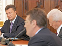 Пан Мороз не підтверджує таку домовленість, водночас кажучи, що законопроект буде найближчим часом розглянутий депутатами, переконуючи, що положення Універсалу про національну єдність враховані, не уточнюючи - в якому обсягу. Водночас, на думку аналітиків, відчувши, що перерозподіл прав буде вигідний лише уряду Януковича, а не парламенту, спікер Олександр Мороз останнім часом вдається до кроків, які б посилили його політичний імідж, зокрема, в царині впливу на зовнішню політику, про що не в останню чергу засвідчили дії пана Мороза в Москві. Тим часом прем’єр Віктор Янукович теж сказав у понеділок про готовність документу для розгляду у Верховній Раді, але на запитання Бі-Бі-Сі, чи відбувається узгодження положень Законопроекту з президентською командою, сказав, що статті узгоджені між представниками антикризової коаліції. Зі свого боку на тлі посилюваних заяв про можливість перерозподілу прав у формуванні зовнішньої політики, Секретаріат президента вдався до кроків у відповідь, і минулої п’ятниці скликав брифінг, на якому лунали наполягання, що згідно з Конституцією, саме президент зберігає всі важелі для керівництва зовнішньою політикою. Нагадавши, що основний закон чітко розмежовує права – парламент ухвалює основи зовнішньої політики, президент керує зовнішньополітичною діяльністю, а уряд – забезпечує реалізацію задекларованого курсу. Та й сам президент Віктор Ющенко підтвердив нинішніми вихідними, що він погодиться зі змінами до Закону про основи внутрішньої і зовнішньої політики, який був ухвалений ще 93 року, якщо вони відображатимуть дійсно актуальні для країни питання. Це, зокрема, євроатлантична інтеграція, нові економічні, моральні і гуманітарні пріоритети. Пан Ющенко застеріг, що не погодиться зі змінами, які матимуть на меті – повернути в бік ревізії тих політичних дій і поглядів, які виникли в Україні за останні роки. Нагадавши, що внесені зміни викликатимуть доцільність, якщо вони будуть відображати ключові позиції Універсалу. Але саме цього бажання, на думку Секретаріату президента, не має у прихильників ухвалення змін до Закону про основи зовнішньої політики. Водночас експерти кажуть, що за нинішнього розкладу сил у Верховній Раді, саме вона може сказати вирішальне слово. Втім більшість аналітиків твердять, що зміни до Закону можуть бути впроваджені лише у разі, якщо буде досягнуто компроміс і погоджені позиції, зокрема, у питанні НАТО. В іншому разі, на думку директора Центру політичних досліджень ПЕНТА Володимира Фесенка, закон буде ветований президентом. В кінці тижня в Україну на переговори з Віктором Ющенком прибуде керівник зовнішньої політики ЄС Хав’єр Солана, з яким президент, скоріш за все, поділиться своїми думками щодо можливого виходу з проблемної ситуації. | Також на цю тему Рада перенесла розгляд законів по СОТ17 жовтня, 2006 | УКРАЇНА Наша Україна перейшла в опозицію17 жовтня, 2006 | УКРАЇНА Ющенко закликав берегти соборність України14 жовтня, 2006 | УКРАЇНА Суперечливі заяви Мороза у Москві 13 жовтня, 2006 | УКРАЇНА Мороз готує грунт для зустрічі Ющенка та Путіна12 жовтня, 2006 | УКРАЇНА | |||||||||||||||||||||||||||||||||||||||||||||||||||||||||||||||||||||||||||||||