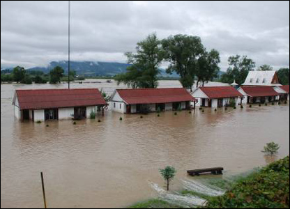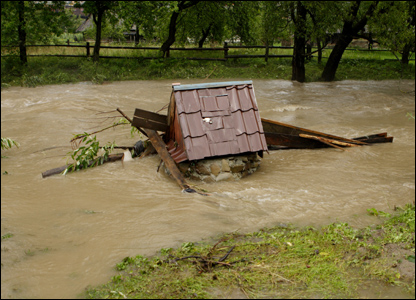 Затоплений будинок у селі Нижнів Тлумацького р-ну Івано-Франківської обл., 27 липня 2008 р. У Івано-Франківській обл. в результаті стихії без зв’язку залишилися 610 населених пунктів. Фото УНІАН