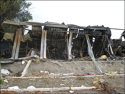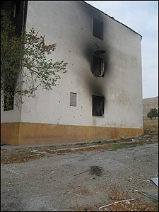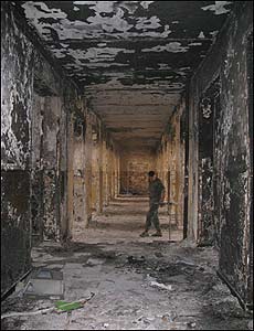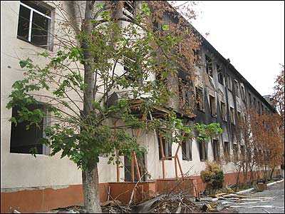 Грузинський військовий оглядає приміщення казарми, яка повністю згоріла.