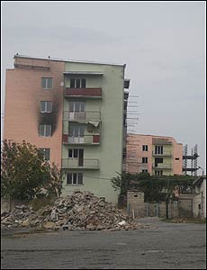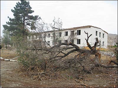 Будинки поблизу військової бази, що зазнали бомбувань російської авіації. Їх починають ремонтувати: вже зроблений новий дах і переважна більшість вікон.