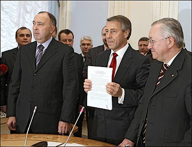 Зліва направо: новообраний керівник фракції Блоку Литвина Ігор Шаров, лідер "бютівської" фракції Іван Кириленко й заступник голови фракції НУ-НС Борис Тарасюк на церемонії підписання коаліційної угоди - 16 грудня 2008 року. Фото Укрінформу