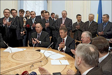 Ігор Шаров, лідер "бютівської" фракції Іван Кириленко й заступник голови фракції НУ-НС Борис Тарасюк вітають один одного з підписанням коаліційної угоди - 16 грудня 2008 року. Фото Укрінформу