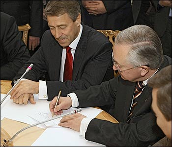 Заступник голови фракції НУ-НС Борис Тарасюк (праворуч) підписує коаліційну угоду 16 грудня 2008 року; ліворуч - лідер фракції БЮТ Іван Кириленко. Фото Укрінформу