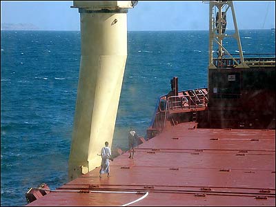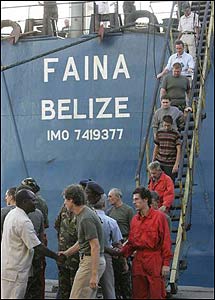 Члени команди всесвітньовідомого українського судна «Фаїна», звільненого з полону піратів Сомалі, спускаються по трапу під час прибуття в кенійський порт Момбаса (Кенія) 12 лютого цього року | ||||||||||||||||||||||||||||||||||||||||||||||||||||||||||||||||||||||||||||||||