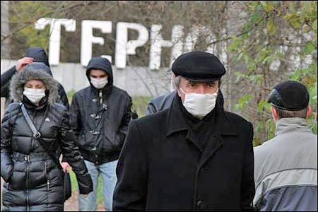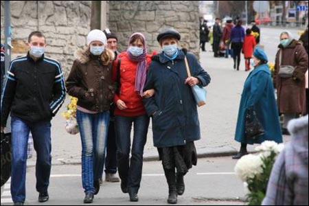 Люди у марлевих пов’язках на одній з вулиць Тернополя, в неділю, 1 листопада 2009 р. Фото УНІАН