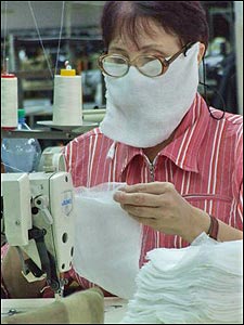 Співробітниця виробничого швейного об’єднання ВАТ ”Трембіта” у марлевій пов’язці виготовляє марлеві пов’язки у Чернівцях, в неділю, 1 листопада 2009 р. Фото УНІАН