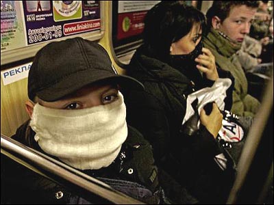 Молоді люди в марлевих і респіраторних масках їдуть у вагоні метро у Києві, в суботу, 31 жовтня 2009 р. Фото УНІАН