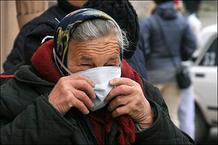 Літні люди у респіраторних масках на одній з вулиць Харкова в неділю, 1 листопада 2009 р. Фото УНІАН