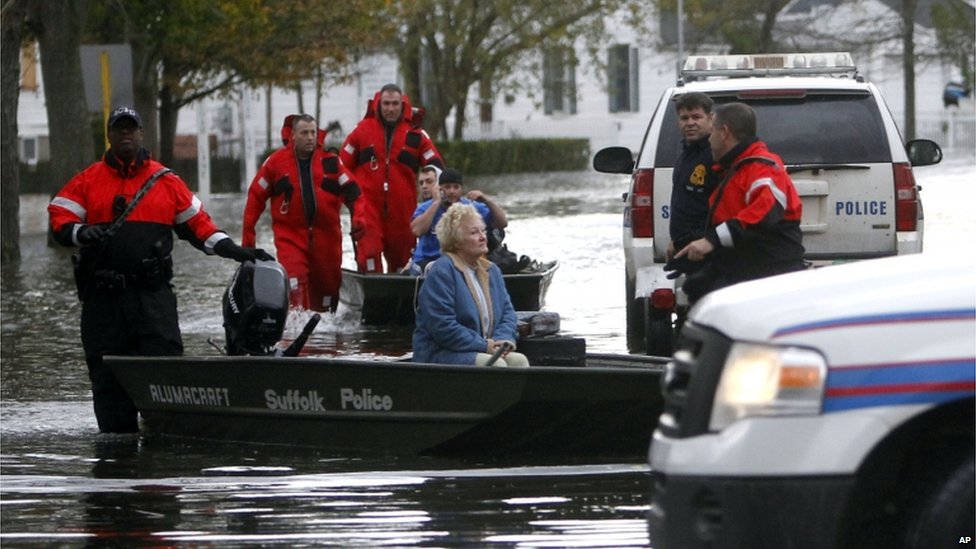 Рятувальники вивозять мешканців Лонг-Айленда в Нью-Йорку, які проігнорували наказ міської влади про евакуацію перед штормом і тепер опинилися в затоплених будинках.