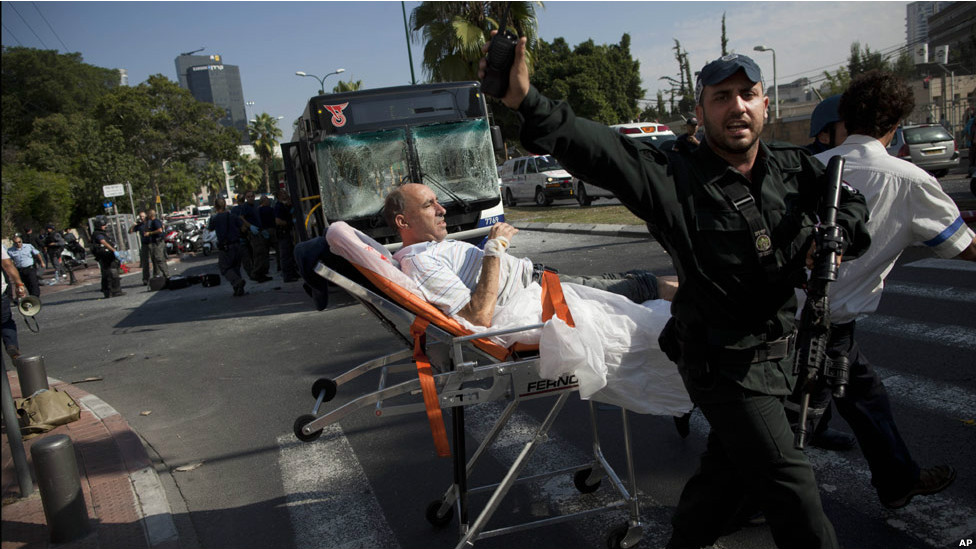 Рятувальні служби Ізраїлю проводять медичну евакуацію пораненого внаслідок вибуху автобуса у Тель-Авіві у середу.