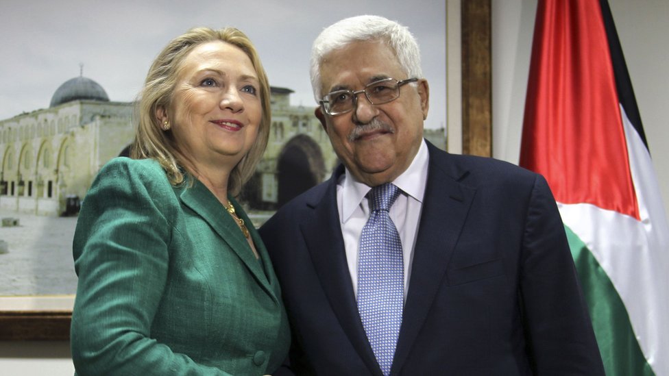 Міжнародна спільнота намагається сприяти поновленню переговорів щодо припинення вогню. На фото державний секретар США Гілларі Клінтон під час зустрічі з главою Палестинської адміністрації Махмудом Аббасом.