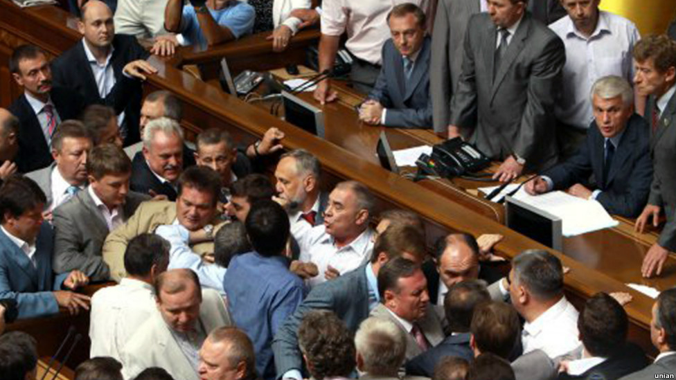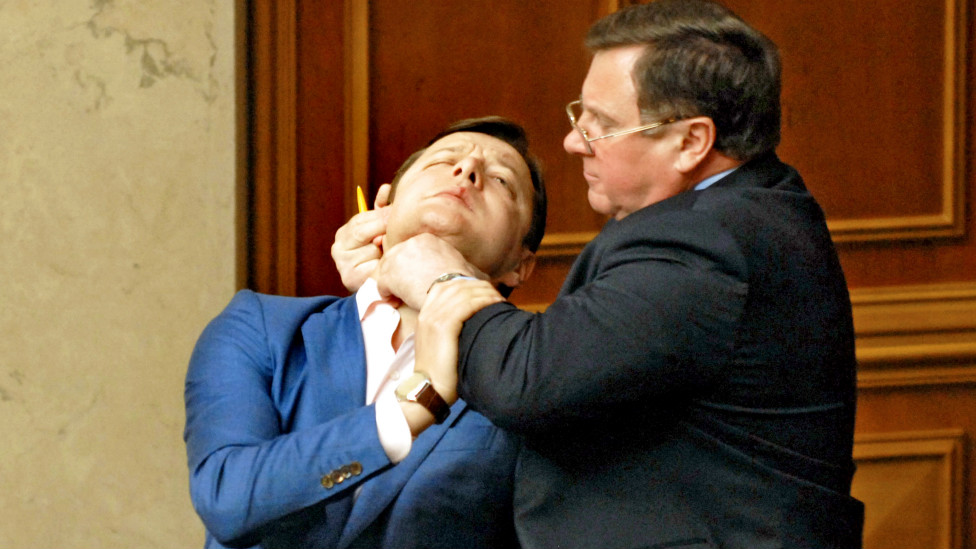 - Історія українського парламентаризму багата на схожі інциденти. Така ситуація між віце-спікером Адамом Мартинюком (КПУ) та депутатом Олегом Ляшком виникла після того, як депутат почав наполягати, щоб йому дали слово. У відповідь Адам Мартинюк попросив "його не вчити". Завершилось це тим, що комуніст схопив пана Ляшка за горло.