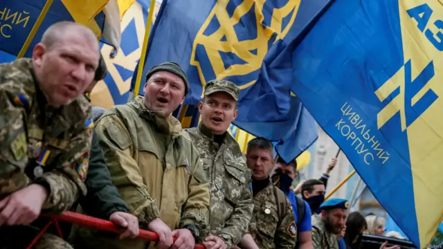 Активісти Цивільного корпусу"Азов" маршували у центрі Києва з прапорами, димовими шашками та фаєрами. Вони вимагали не проводити вибори на Донбасі без відновлення контролю над усім українським кордоном на Сході.