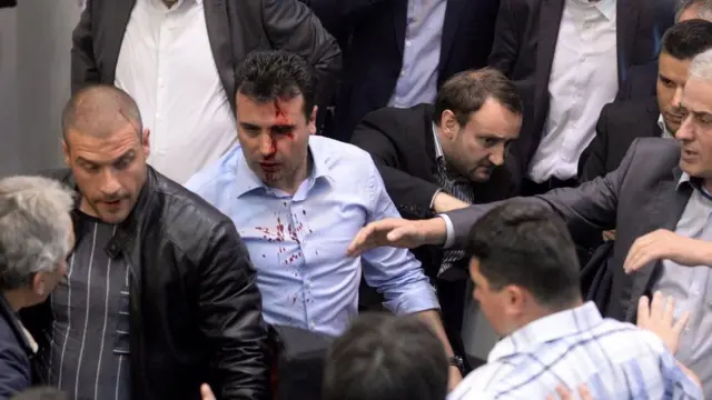 У результаті штурму постраждали щонайменше 10 людей, з-поміж них лідер македонських соціал-демократів і найімовірніший претендент на пост прем'єр-міністра Зоран Заєв. На фото видно, як його обличчям струменіє кров.