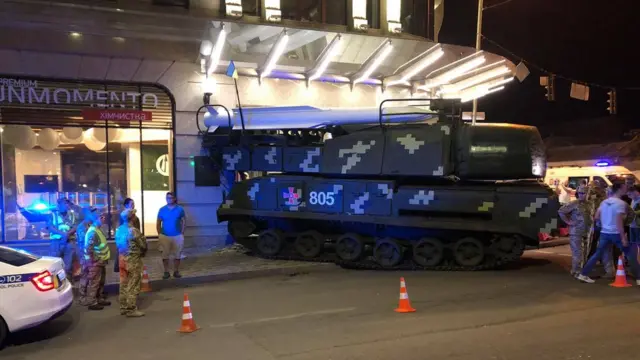 Увечері в суботу в Києві зенітно-ракетний комплекс "Бук", що повертався з репетиції параду до Дня незалежності України, в'їхав в будівлю бізнес-центру "Астарта".