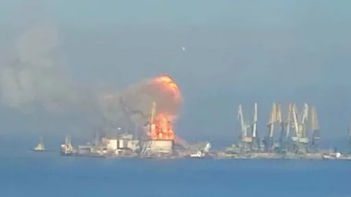 "У захопленому РФ порту Бердянськ знищено великий десантний корабель "Орськ" чорноморського флоту окупантів", - написали у фейсбуці о 7 ранку в четвер українські військові, додавши фото та відео, на якому чути вибухи та видно, як палає судно.