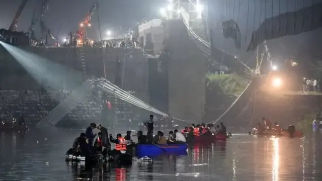 Сотні людей впали в річку Мачу в місті Морбі. На кадрах з місця події видно, як люди висять на частково затопленому підвісному мосту.