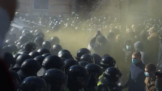 Участники акции попытались прорвать кордон правоохранителей. Произошла небольшая потасовка, в ходе которой применили слезоточивый газ.