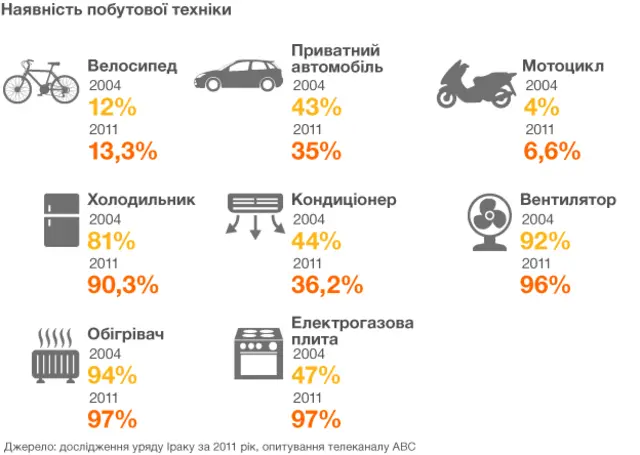 Попри проблеми з електропостачанням, деякі побутові товари і предмети повсякденного вжитку більш поширені, ніж були у 2003 році. Як випливає з дослідження, проведеного іракським урядом, кількість автомобілів у приватній власності зменшилася, але зросла кількість людей, які послуговуються велосипедами і мотоциклами.