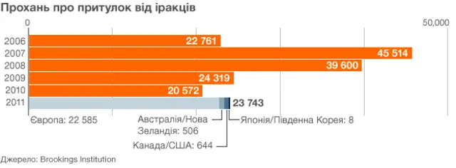 Багато тисяч іракців досі шукають притулку за кордоном. У 2011 році 23 743 іракців написали заяви з проханням про надання їм політичного притулку за кордоном - здебільшого у країнах ЄС.